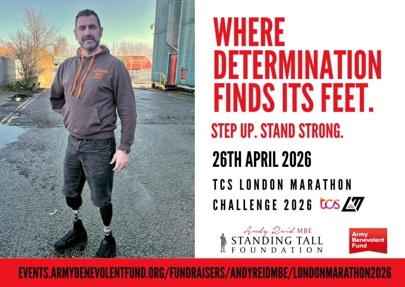 Peter Monteith, Chief Operating Officer at the Army Benevolent Fund, added: “We are so grateful that our ambassador, Andy Reid MBE, is taking part in the TCS London Marathon in aid of the Army Benevolent Fund and the Standing Tall Foundation. Andy has experienced life-changing injuries but does not let them define him. He is dedicated to serving others – raising thousands for the ABF, establishing his own charity, and inspiring many people with his story of resilience and recovery. We wish Andy the best of luck in his training and look forward to supporting him along the way.”
